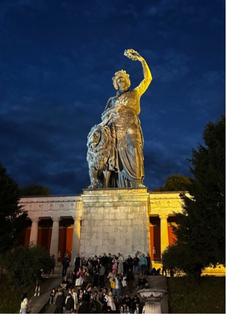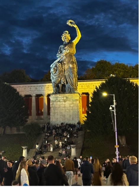 Festival alanında yürürken, görkemli bir figür dikkatimizi çekiyor: Theresienwiese’nin tam kalbinde yükselen Bavyera Heykeli ve onun yanı başındaki aslan figürü