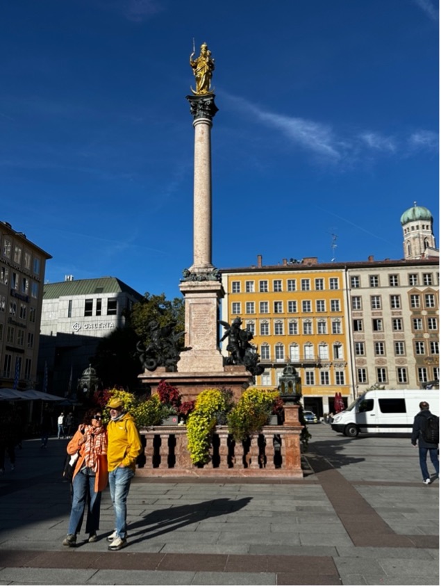 Meydanda ilerlemeye devam edince, meydanın tam ortasında yükselen ve Münih’in en önemli dini ve tarihi anıtlarından biri olan Mariensäule (Meryem Sütunu) karşınıza çıkıyor. Meryem Ana, Münih’in ve tüm Bavyera’nın koruyucusu olarak kabul ediliyor. Sütunun tepesinde yer alan altın kaplamalı Meryem Ana heykeli, sol kolunda Bebek İsa’yı taşırken sağ elinde bir asa tutuyor. Bu pozisyon, gücü ve kutsal rehberliği simgeliyormuş.