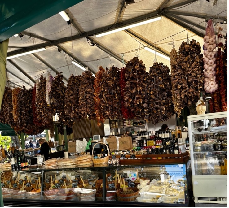 Pazar tezgahlarında yok yok. Taze meyve sebze, peynir ve et ürünlerinin yanı sıra büyük pretzeller, sosisler, taze pişirilmiş ekmekler ve yerel şarküteri ürünleri pazarın en popüler ürünleri arasında ilk sırada.