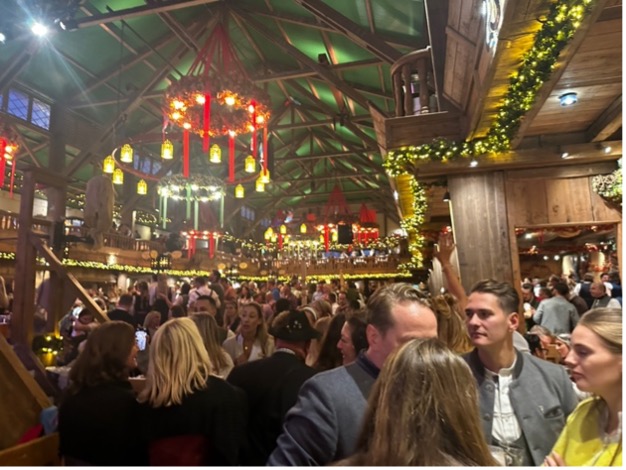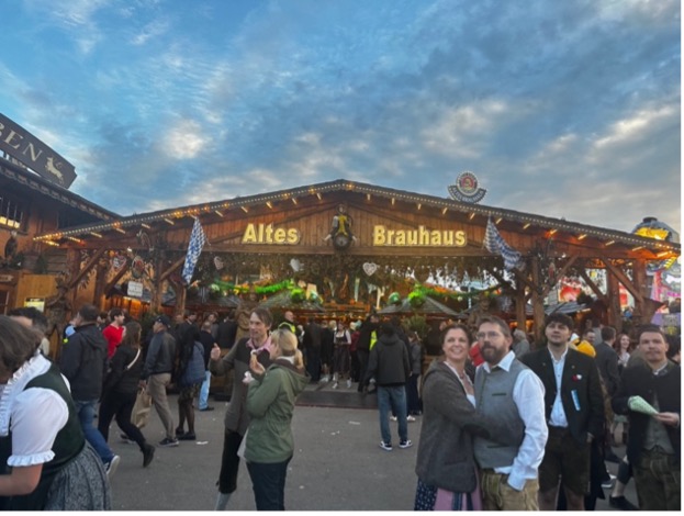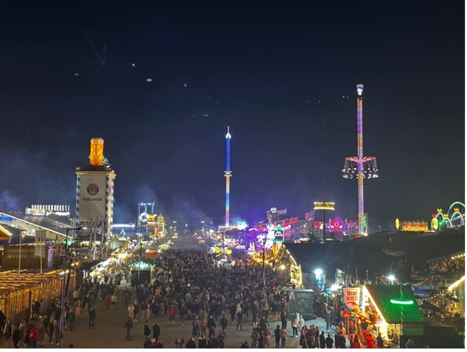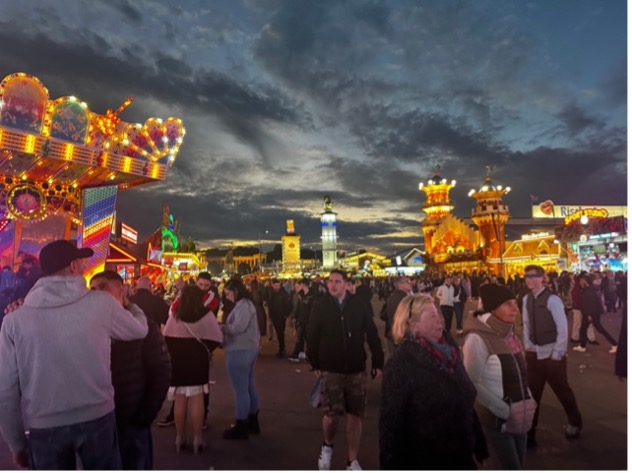Şehre adım atar atmaz, otelimize yerleşip kısa bir mola verdik. Grip nedeniyle kendimi halsiz hissetsem de dinlenmek için fazla vaktimiz yoktu; çünkü Münih’in ruhunu en güçlü şekilde hissedebileceğimiz yere, Oktoberfest alanına doğru yola koyulmalıydık.  Geliş günümüz, Oktoberfest’in son günü olan 6 Ekim 2024 olduğundan bu tarihi festivali deneyimlemek için elimizde sadece tek bir akşam vardı. O yüzden hastalık falan düşünmeden, vakit kaybetmeden festival alanına doğru yol aldık.